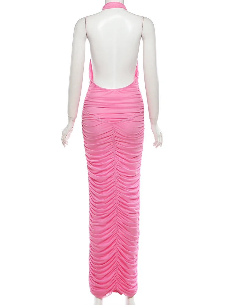 Cutenew Valentine's Day Dress Women Backless Halter Mesh Pleat Classic Peach Hip Sexy Stretch Skinny Elegant Dating Bodycon