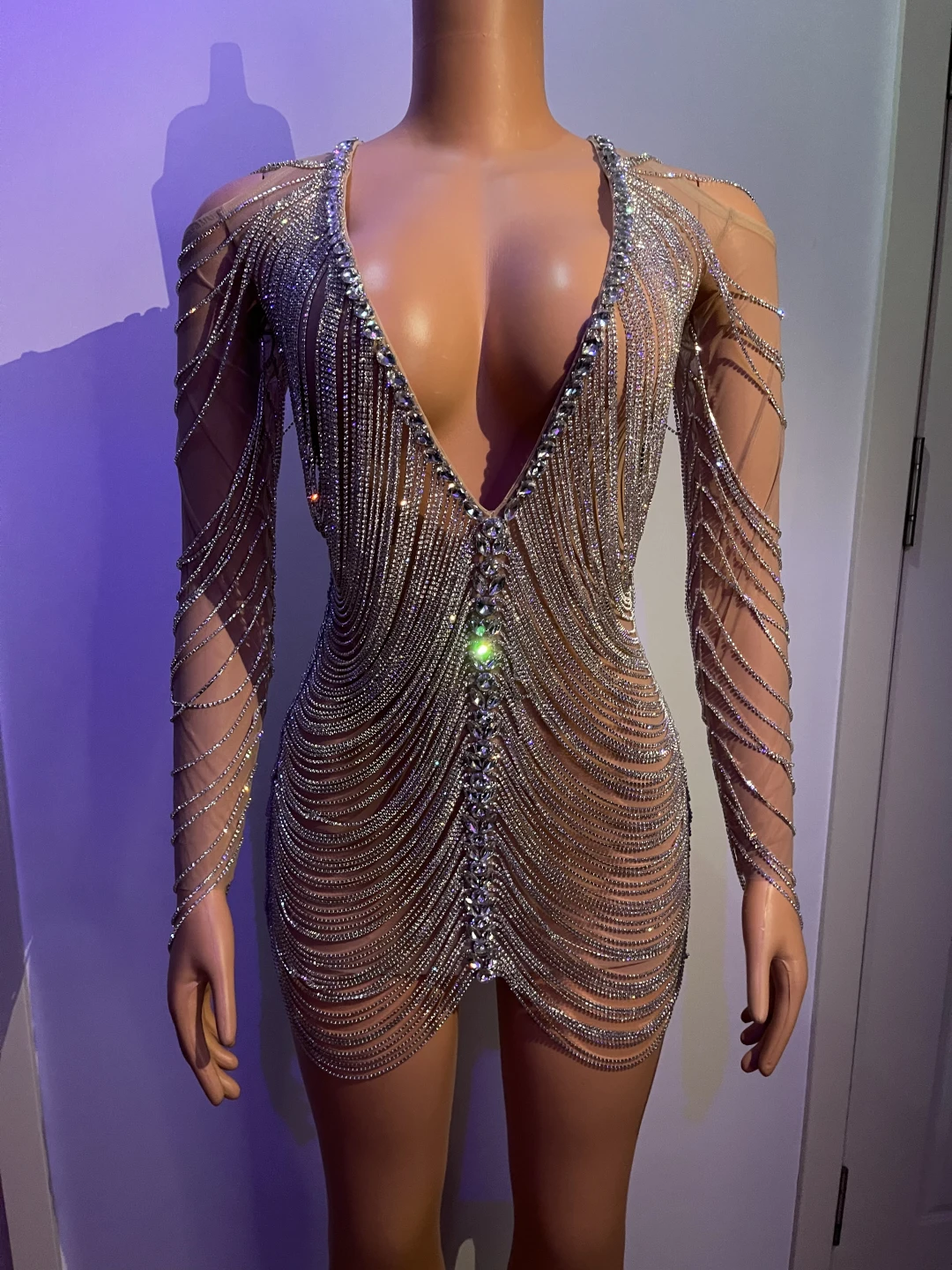 Valentine Day Outfit Sparkly Rhinestone V Neck Birthday Dress Chain Sleeve Jazz Dance Costume Nightclub Performance Wear Wanwan